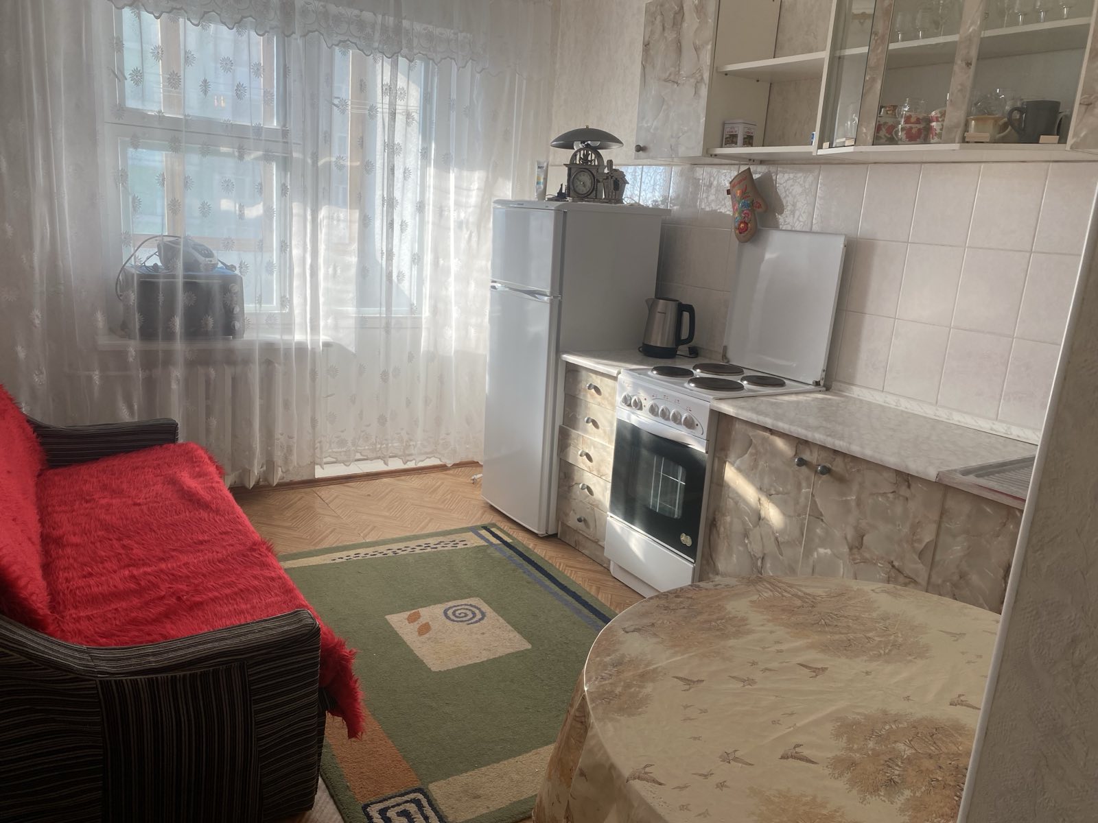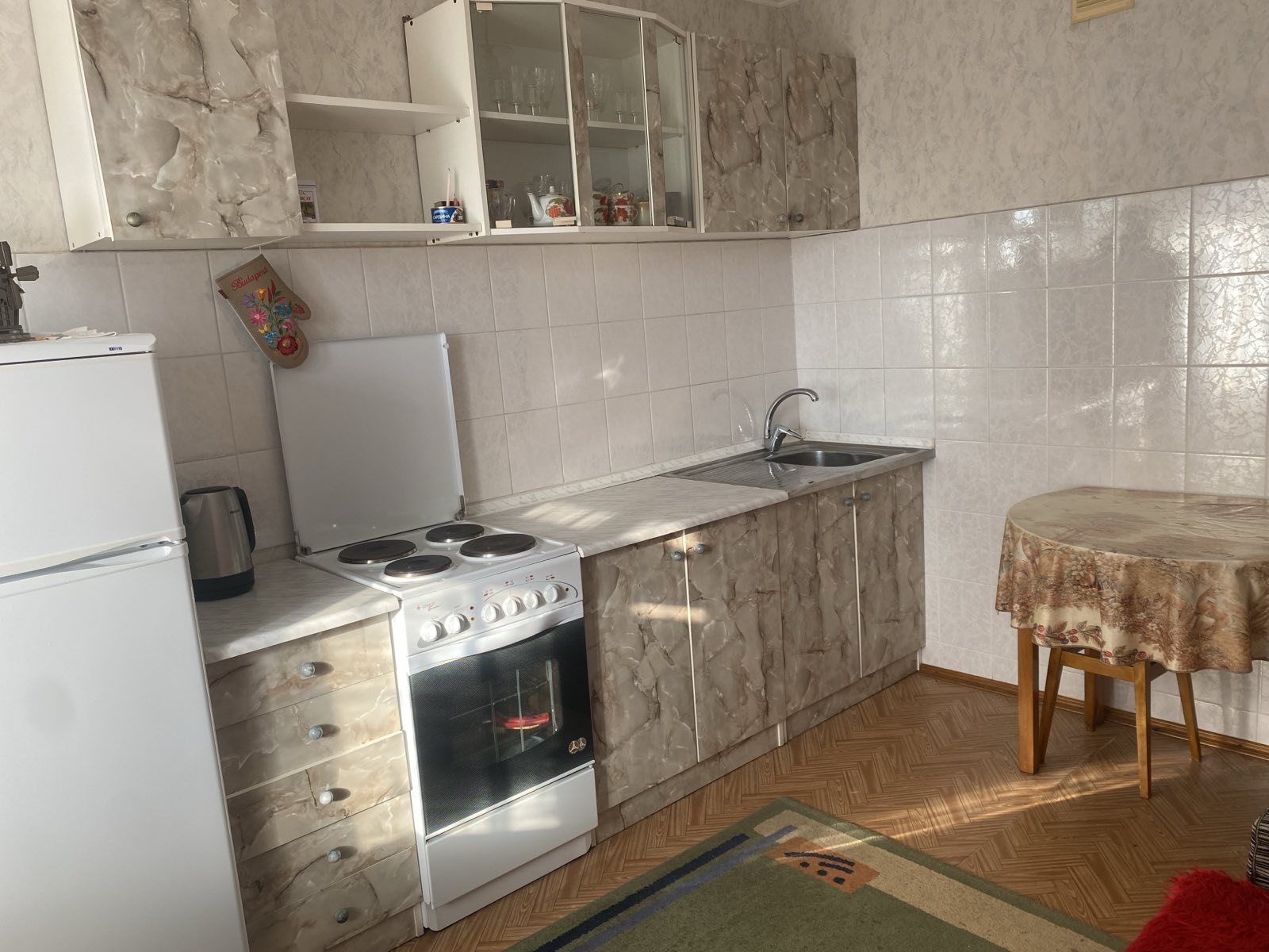 На кухні обідній стіл, стільці, диван, кухонний гарнітур, ел.плита, холодильник, ел.чайник.