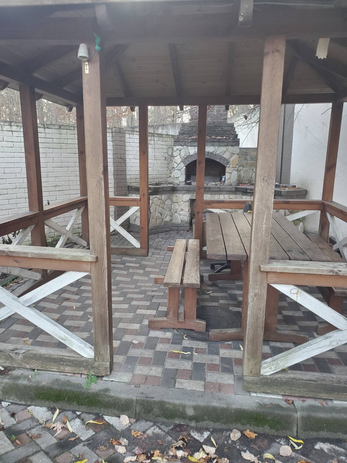 Навколо будинку гарна прибудинкова територія в тротуарній плитці, сосни, свіже повітря.