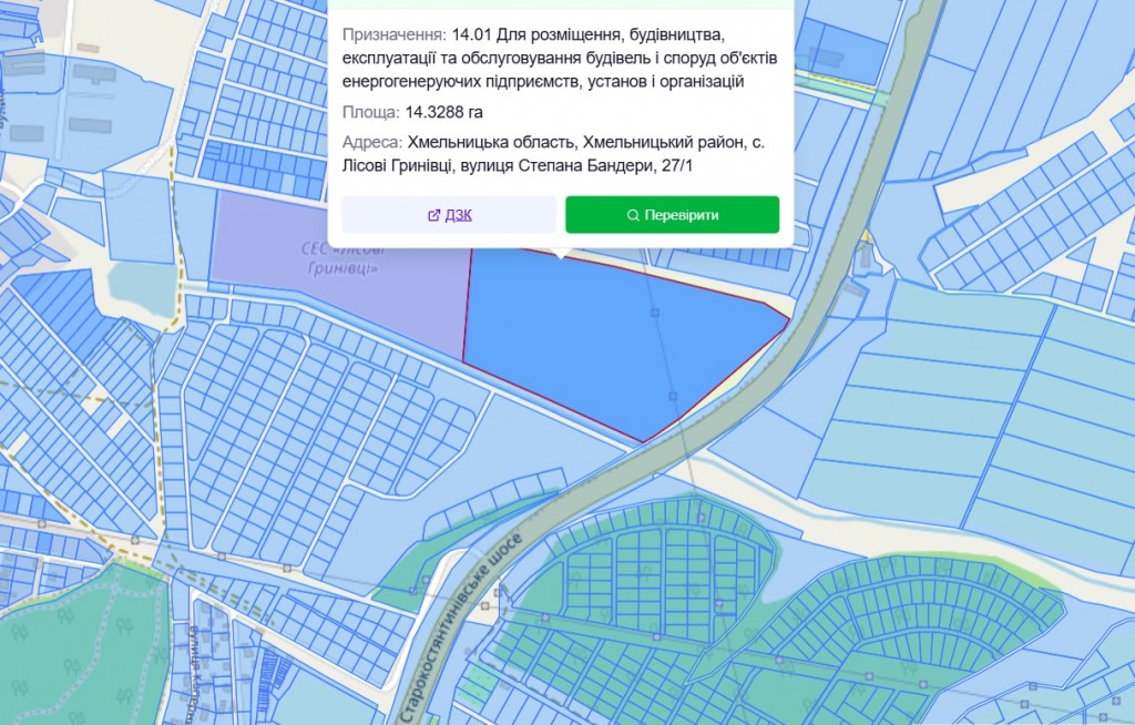 Продам велику земельну ділянку в передмісті Хмельницького, Лісові Гринівці. Площа: 14,3288 Га Вартість: 788 000$ (550$/сотка)+ витрати на переоформлення. Кад.№: 6825083600:03:007:1982 Призначення: 14.01 Для розміщення, будівництва, експлуатації та обслуговування будівель і споруд об'єктів енергогенеруючих підприємств, установ і організацій Власність: приватна. Адреса: Хмельницька область, Хмельницький район, с. Лісові Гринівці, вулиця Степана Бандери, 27/1 Розташування: знаходиться в масиві між СЕС"Лісові Гринівці" Старокостянтинівським шосе. Фасадна частина до траси - 365м.. Гарна інвестиція. Можна змінити призначення під будівництво. Пропозиція від представника власника.