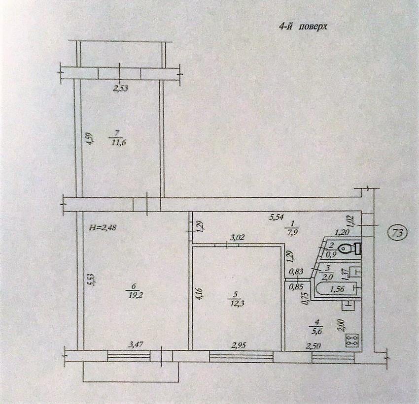 4 поверх 9-поверхового цегляного будинку. Загальна площа – 61,6 кв.м: кухня – 5,6 кв.м, дві окремі кімнати, одна – прохідна, санвузол роздільний.