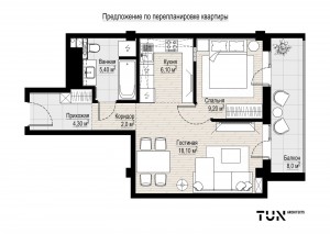 Загальна площа – 50 кв. м: зона кухні 6,1 кв.м з виходом у вітальню 18,1 кв.м, ізольована спальня - 9,2 кв.м, санвузол 5,4 кв.м, лоджія 8 кв.м.